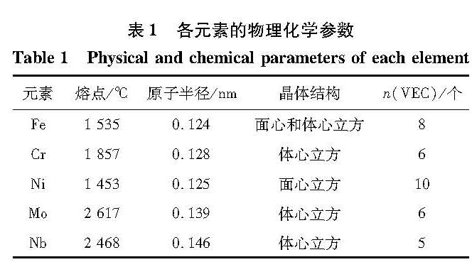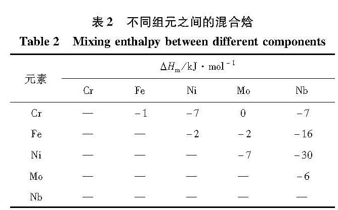 2 实验结果分析2.1 合金成分的设计根据共晶高熵合金设计策略[15-16],以CrFeNiMo系高熵合金为基础,添加Nb元素,并配置比例,设计出CrFeNiMo0.2Nbx系高熵合金。表1为合金中各元素的物理化学参数,其中n(VEC)为价电子数量。表2为合金各组元之间的混合焓值。
