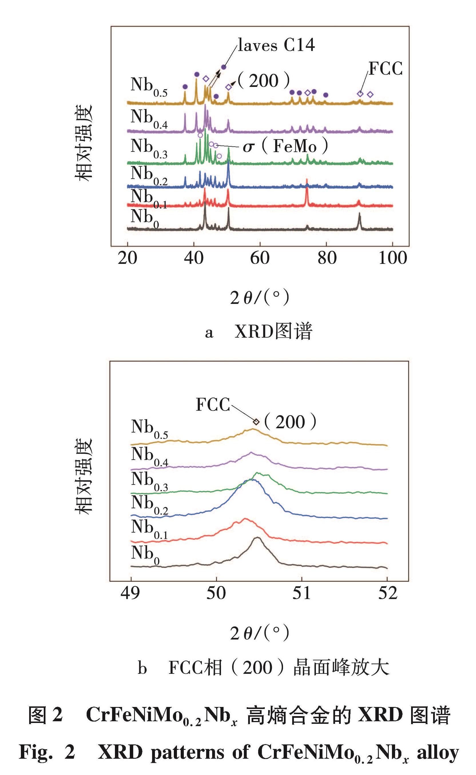 由图2a可知,Nb0合金除了4个FCC相的衍射峰以外,还有FeMo型σ相对应的衍射峰位[12],与蔡司显微镜观察得到的微观组织相匹配,Nb0合金中,树枝晶为FCC相固溶体基体组织,晶界间的少量析出物为FeMo型σ相,随着铌摩尔比的增加,如Nb0.1~Nb0.3合金所示,σ相对应的衍射峰不断的增强,同时出现了 C14型laves相[15],但基体FCC相的峰位依然存在,说明基体组织依然为FCC固溶体,而树枝晶晶界间为FCC相和Laves相组成的共晶组织和少量的FeMo相析出物,进一步与2.2的结论相匹配。当铌摩尔比继续增加到Nb0.4合金时,在Nb0.1~Nb0.3合金中衍射强度较弱的FeMo相衍射峰消失,FCC相对应的衍射峰强度进一步减弱。Nb0.5合金的XRD图谱整体与Nb0.4合金一致,但laves相对应的衍射峰随着Nb摩尔比的增加在增强,这说明随着Nb摩尔比的增加,树枝晶晶界间的层片状共晶组织在逐渐增加。图2b为FCC固溶体相(200)晶面衍射峰的放大图,图2b表明,相比于基础合金Nb0,除Nb0.3合金的FCC(200)晶面衍射峰右移,其余合金FCC(200)晶面衍射峰都向左发生不同程度的偏移,表明这几种成分的合金,随着Nb元素的添加,使得FCC基体发生了晶格畸变,增大了其晶格常数,部分Nb固溶于FCC基体中。