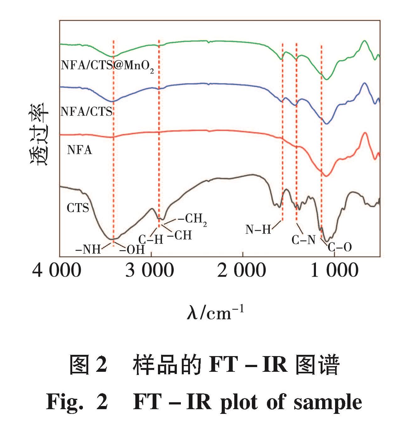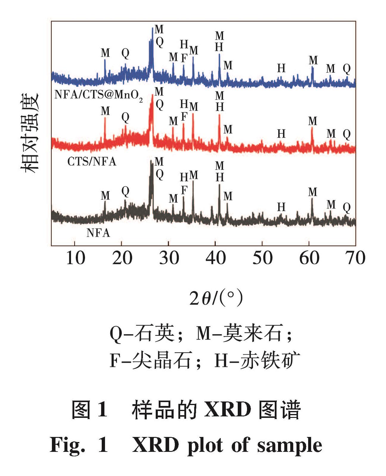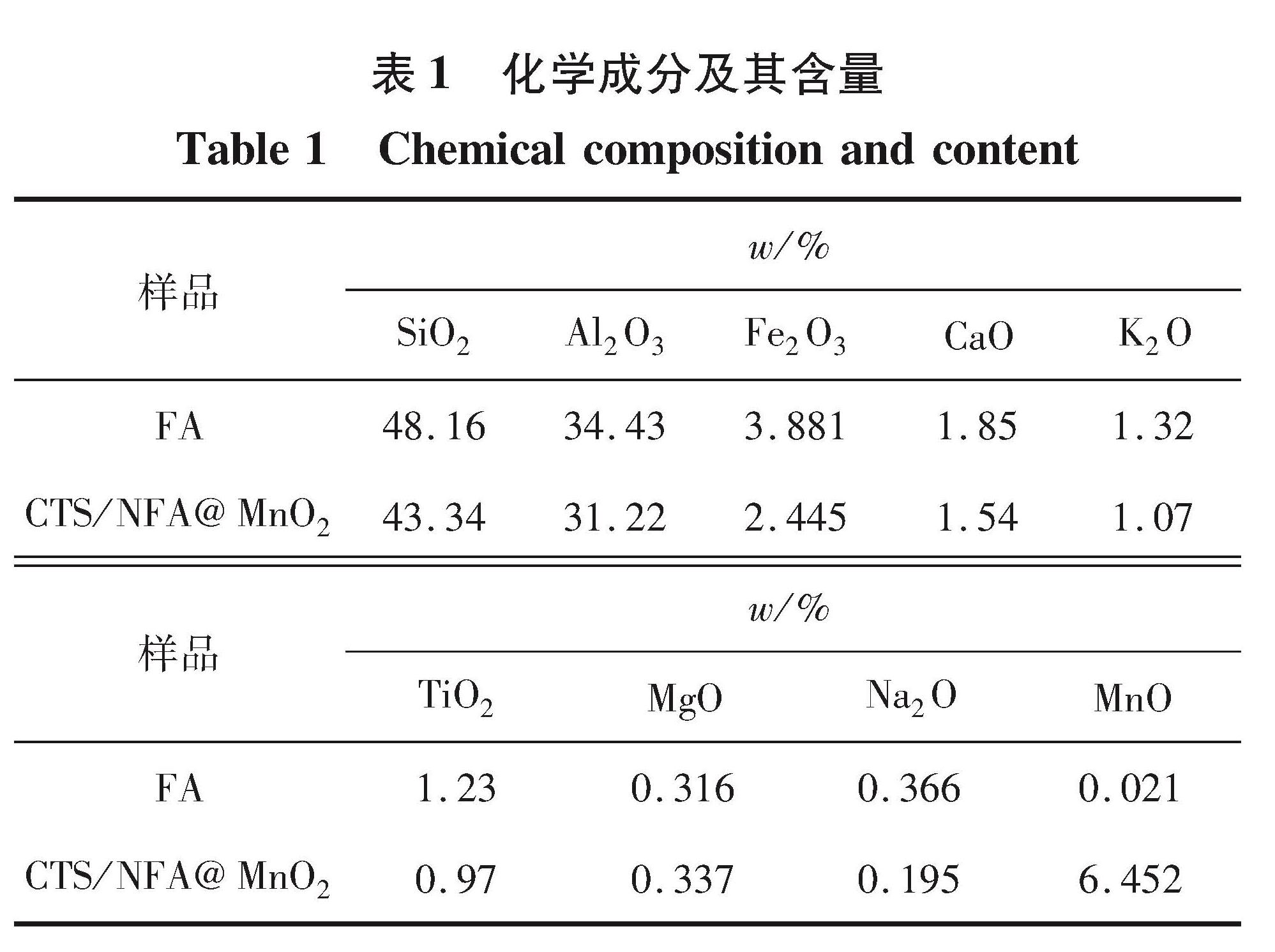 2 结果与分析2.1 复合材料的结构表征2.1.1 成分分析表1为样品成分分析表,由表1可知,本实验的FA为F级低钙灰,这种类型的灰富含丰富的Si、Al 活性点位,活性高、吸附性能好。CaO含量较高会出现自胶结现象[9],遇水发生硬化,表面变得更加致密,不利于吸附。本实验使用的是低钙灰,避免了此类现象的发生。NFA/CTS@MnO2的SiO2、Al2O3和Fe2O3的质量分数分别下降至43.34%、31.22%、2.445%,这可能是负载MnO2致使比例下降。相比FA,MnO的质量分数从0.021%增高到6.452%,说明MnO2已经成功负载到了FA上。