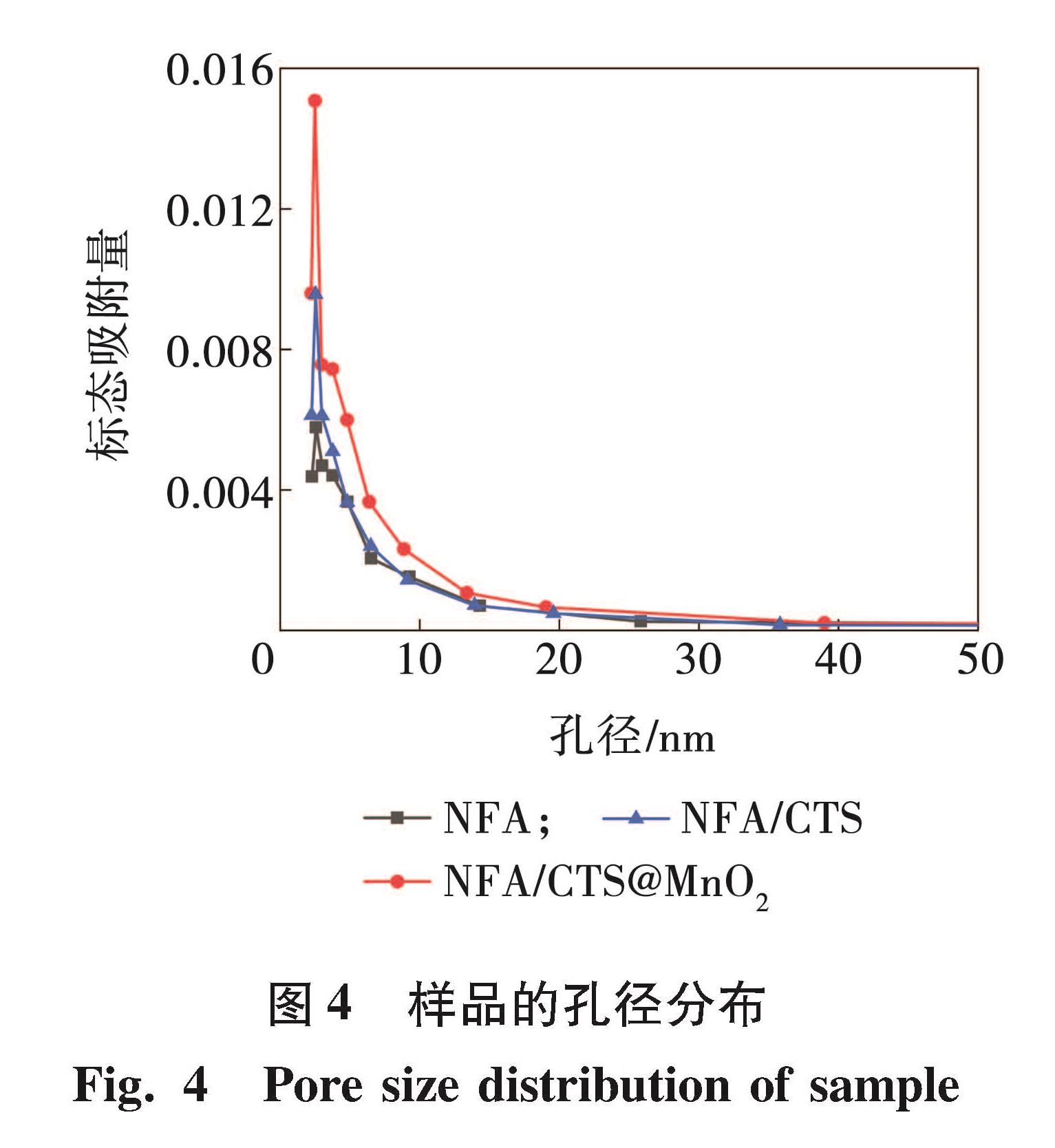 由多层吸附理论经BET方程计算结果得知NFA、NFA/CTS和NFA/CTS@MnO2复合材料的比表面积分别为52.56、54.01、66.92 m2/g,孔容分别0.056 4、0.043 4、0.070 5 cm3/g,相比较而言NFA/CTS@MnO2复合材料的比表面积和孔容在一定程度都有所提高,更有利于发生吸附反应。