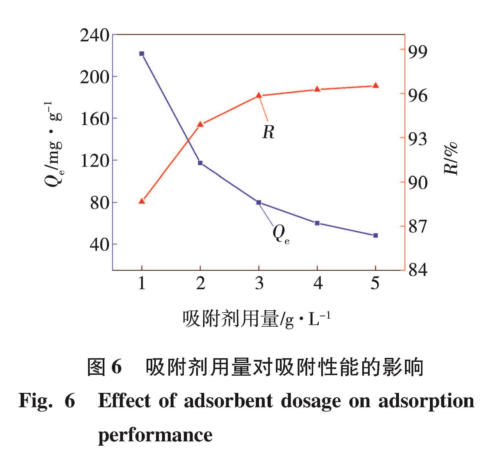 由图6可以看出,随着吸附剂投加量的增加,吸附剂对单一橙黄Ⅳ溶液的吸附量呈现出明显下滑的趋势[19],吸附剂投加量从1 g/L增加到5 g/L时,对橙黄Ⅳ的吸附量从221.65 mg/g降至48.25 mg/g。这是由于随着吸附剂用量的不断增加,溶液中染料分子数量一定,致使吸附剂捕捉不到新的染料分子[20]。考虑环保和节约成本,选用吸附剂投加量为3 g/L最为适宜,此时的去除率高达95.83%。