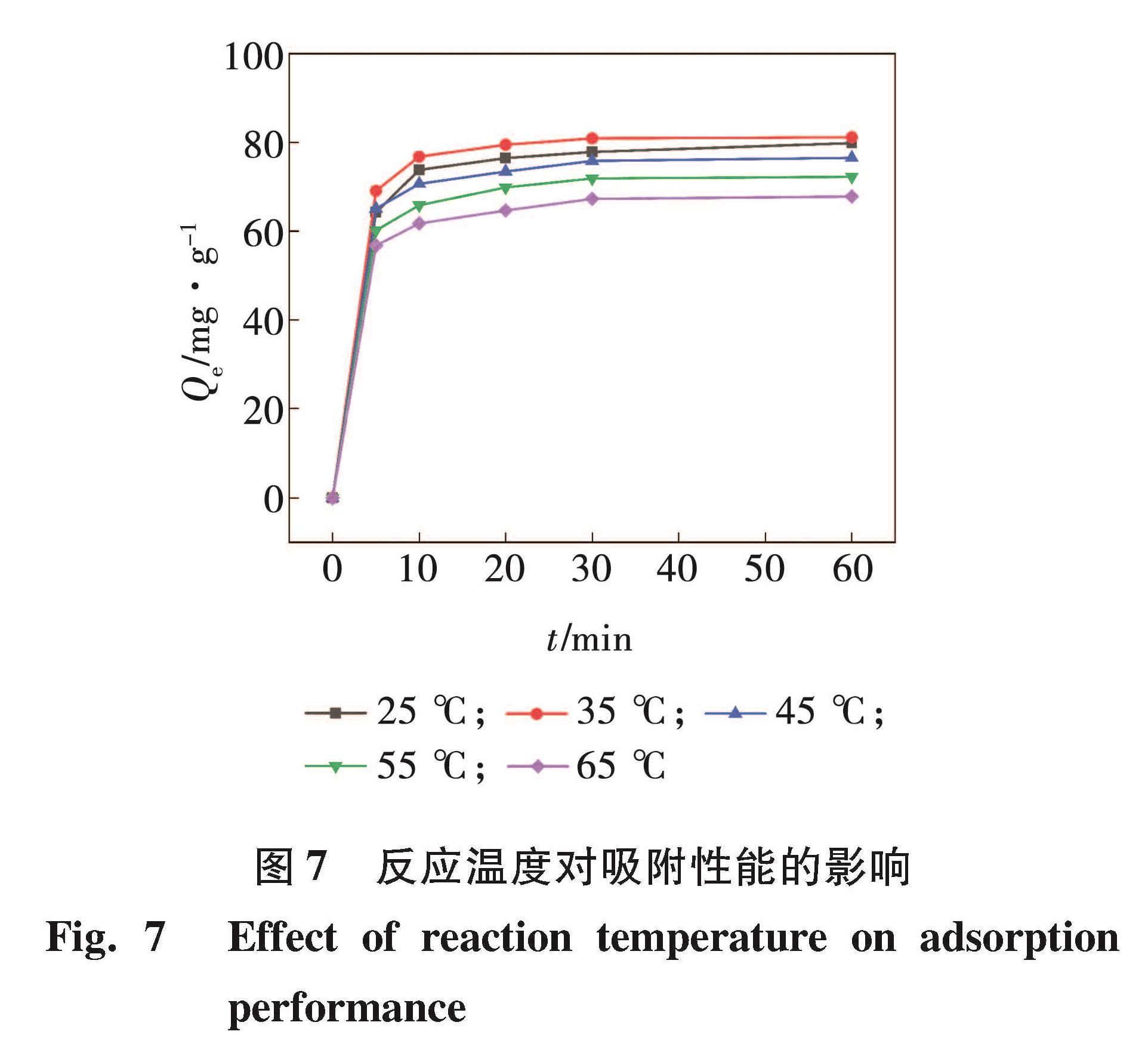 2.2.3 反应温度在2.2.2的基础上,吸附剂投加量设置为 3 g/L,其他条件不变,考察不同反应温度对吸附剂吸附性能的影响。从图7可以看出,反应温度为35 ℃吸附剂吸附效果最好且反应在30 min时吸附达到平衡状态,此时的吸附量为80.92 mg/g。再增加温度,吸附量呈现下降的趋势。这是因为适当的升高温度可以激发NFA/CTS@MnO2复合材料的活性,另一方面可能是温度的升高,MnO2的氧化性提高,吸附染料废水橙黄Ⅳ的性能更好[21]。当温度大于35 ℃时,吸附剂发生了溶胀,活性降低,对吸附反应起阻碍作用[22]。