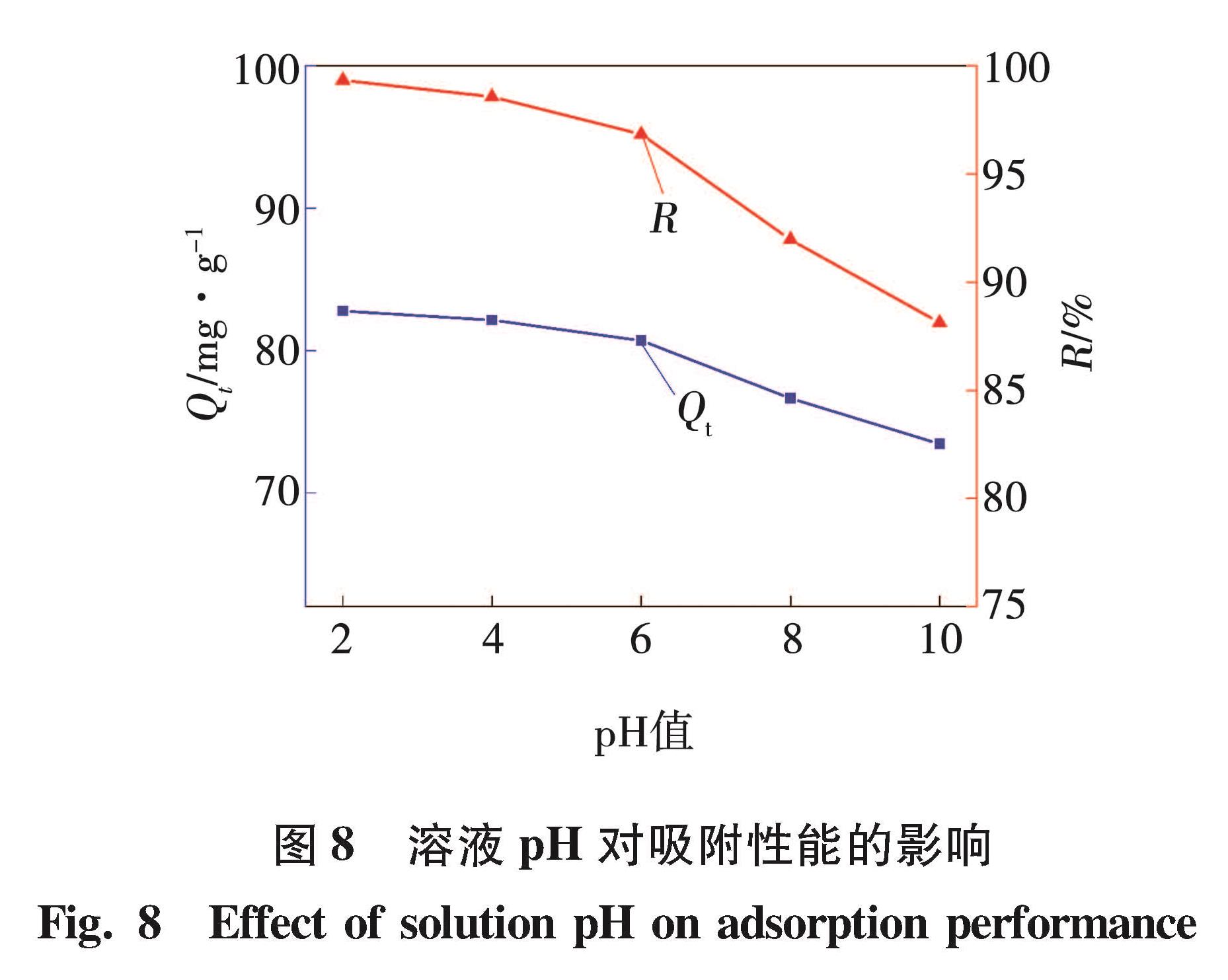 在2.2.3的基础上,将反应温度设置为35 ℃,其他条件不变,探究溶液的pH对吸附剂吸附性能的影响。结果如图8所示。