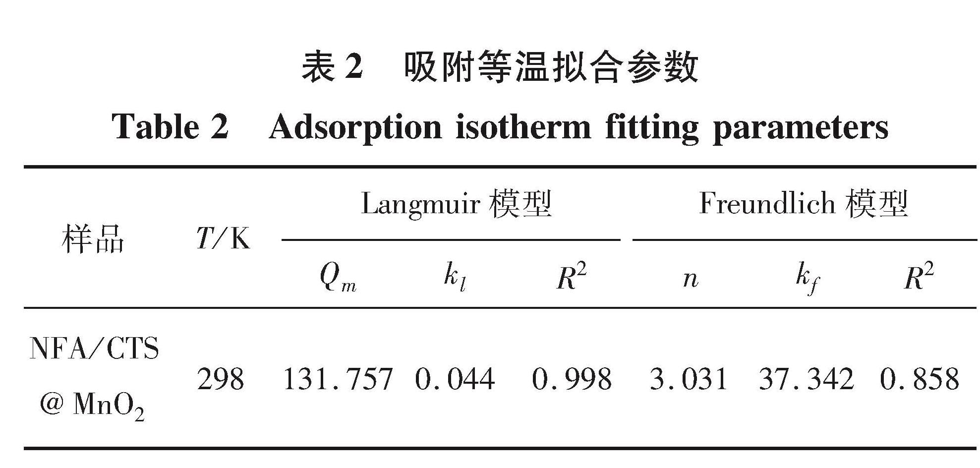 2.2.5 复合材料的吸附等温线为了更加深入研究吸附剂的吸附机理,笔者通过吸附等温模型来具体描述NFA/CTS@MnO2复合材料对橙黄Ⅳ的等温同时吸附过程,本研究使用Langmuir和 Freundlich模型对数据进行拟合分析[23],其相关线性表达式如下。