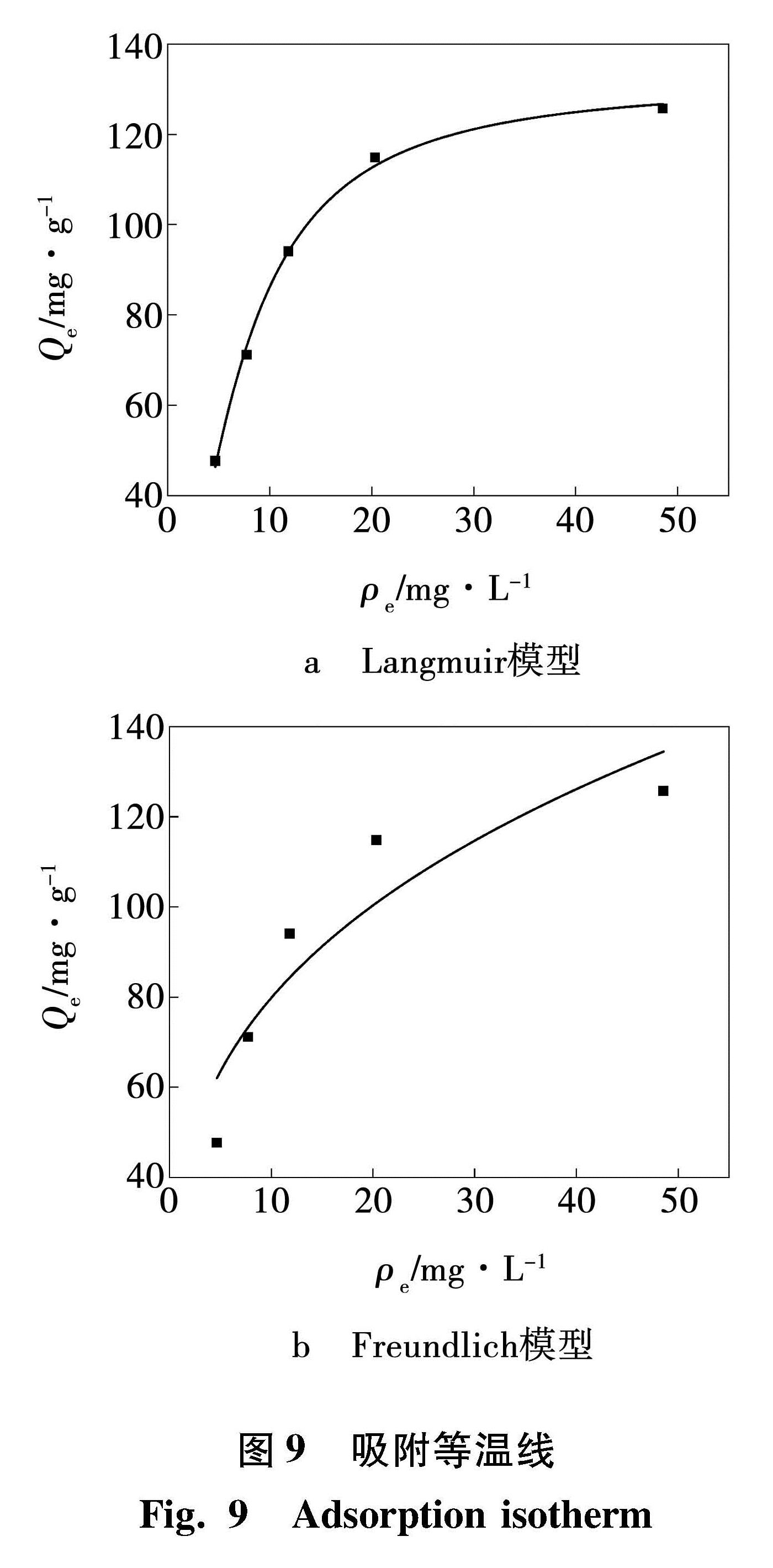 图9a为拟合后的Langmuir吸附等温线,图9b为Freundlich吸附等温线[24]。从图9可以明显看出,吸附剂的Langmuir模型拟合效果更佳。由表2的拟合参数可知,采用Langmuir方程拟合的等温线相关系数为0.998,Freundlich方程拟合的等温线相关系数只有0.858。Freundlich模型中的1/n在0.1~0.5之间,说明吸附剂极易发生吸附反应[25]。综上,复合吸附剂更符合Langmuir等温吸附模型,这与文献[26]得出的结论一致。