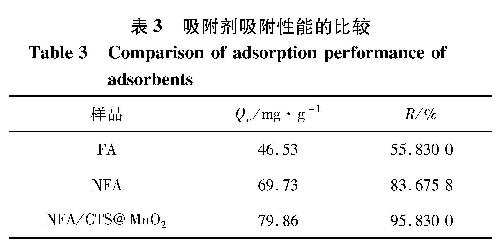 将FA、NFA和NFA/CTS@MnO2三种吸附剂分别吸附50 mL、250 mg/g的橙黄Ⅳ溶液,在室温下进行吸附实验,pH为溶液自身的pH值,吸附剂投加量为3 g/L,比较三种吸附剂的吸附性能,实验结果见表3。