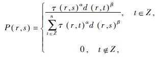假设集合Z包含此次觅食事件中的所有节点(不含节点r),计算一只蚂蚁由节点r到节点s的概率为