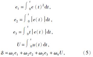 2.3 改进的蚁群算法寻优PID参数在采煤机调高控制系统中,由于控制系统的输入为设定的煤岩分界线u(t),输出为滚筒的截割曲线y(t),无法直观体现“觅食路径”这一关键指标。因此,对蚁群算法进行一定的改进,设置指标函数δ替代路径长度L,用以检验蚁群算法的性能,从而改进整个行为系统,以尽可能降低错误率。故而,文中选取积分平方误差e1(ISE)、积分绝对误差e2(IAE)和积分时间绝对误差e3(ITAE)作为主要评价指标; 而为防止误差为零而影响运算,加入输入u(t)的积分值U作为次要评价指标,对以上进行加权组合,构成指标函数[15]为