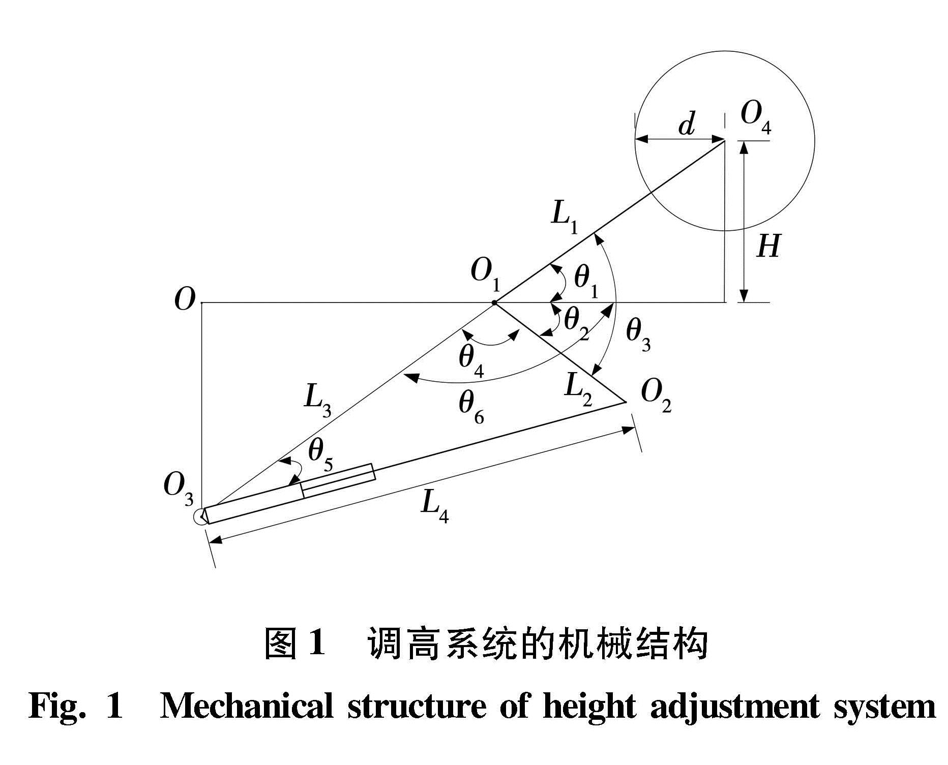 根据图1中几何关系,可知θ1 +θ2 =θ3,θ2 +θ4 =θ6,其中,θ3(大臂L1与小臂L2的夹角)、θ6(两铰接点O1与O3同水平面的夹角)在运行过程中为常数,θ2为小臂L2与水平面的夹角。图1调高系统的几何关系为