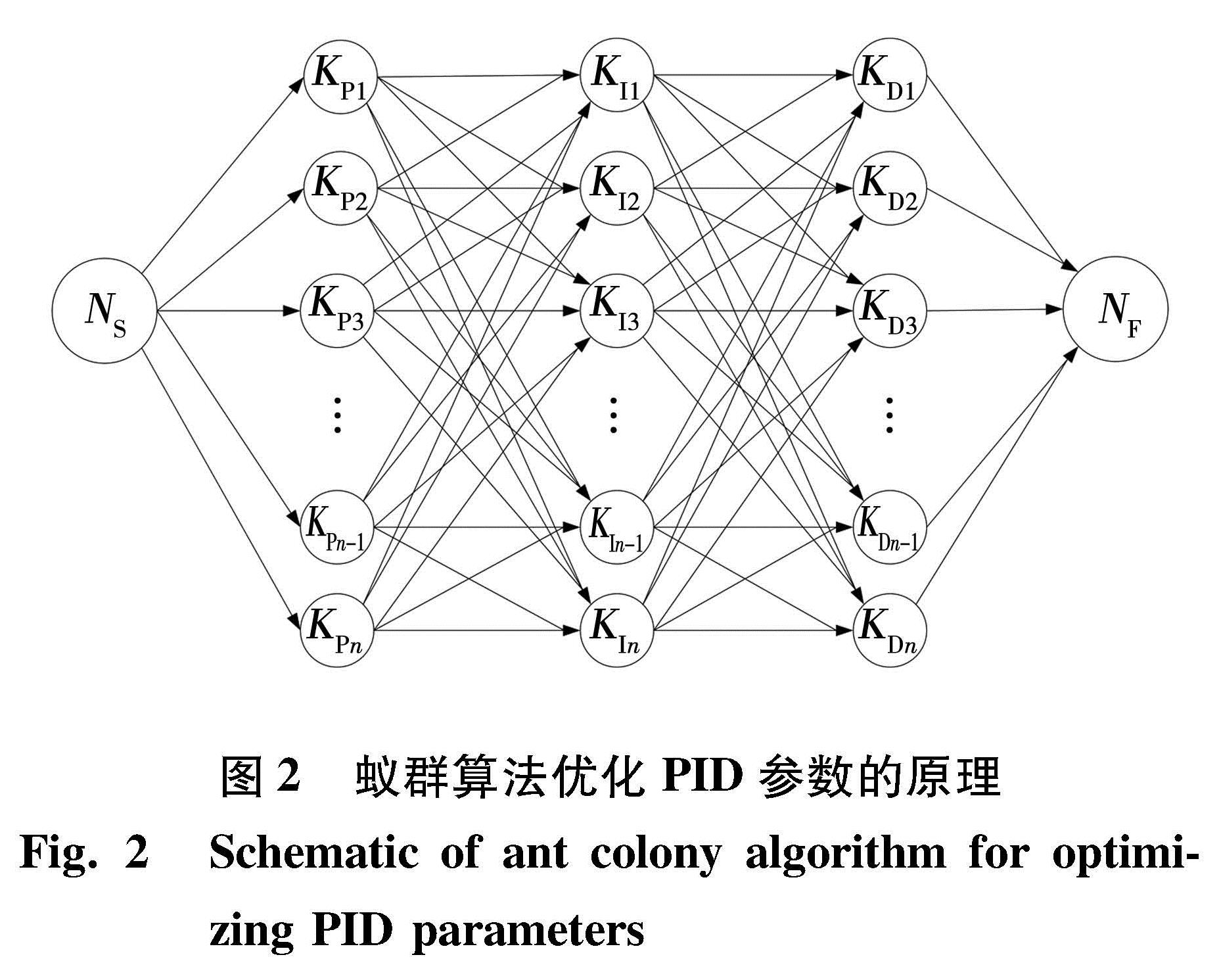 设置开始节点NS与完成节点NF,分别视为蚂蚁的巢穴与食物所在地; 再使用三个不同的向量组分别放置三个参数(KP、KI、KD)相关的所有值,每个向量组视为一个节点群,蚂蚁每次需从中随机选取一个节点作为路径链接点; 节点间的矢量则代表觅食路径方向与长短。蚂蚁从开始节点出发,每次到达一个节点群时,随机选取一个节点行进,最终到达完成节点且在路径中释放信息素,途经的三个随机节点与连接节点间的矢量构成一条觅食路径,而后原路返回,完成整个闭环的觅食工作。整个蚁群经过多次往返,路径中的信息素不断更新,信息素浓度最高的路径所经过的三个节点,即为节点NS、NF之间的三个节点群中的最优的节点,两两之间相互连接,构成最短路径。