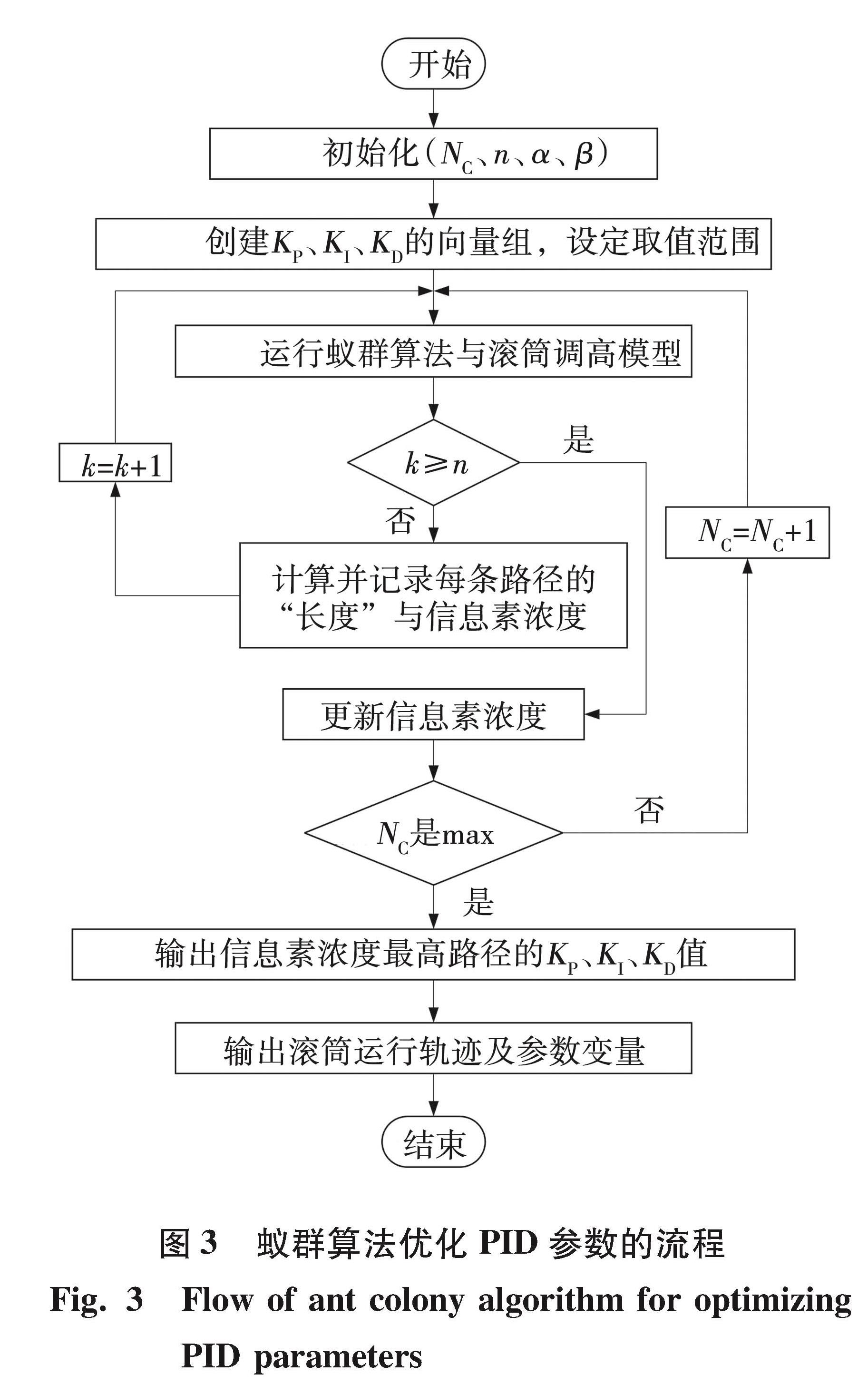 在实际控制系统中,节点间矢量的长度也无法定量描述,因此,将Lm的均值作为dm(r,s)的取值。蚁群算法优化PID参数的流程及优化后的调高系统的结构如图3所示。