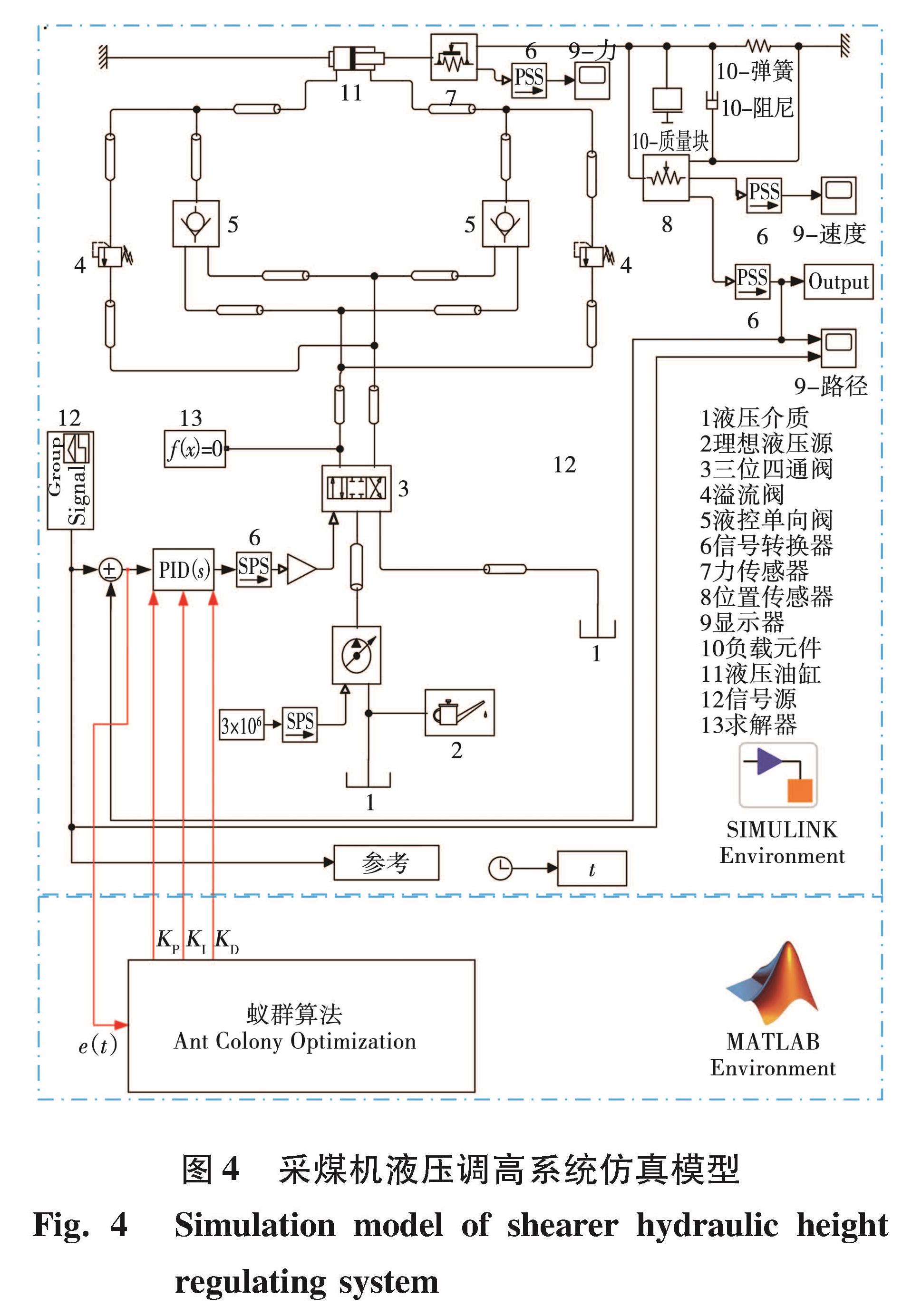 仿真模型以Matlab为载体,液压调高控制系统由Simulink中的hydraulics模块搭建而成,蚁群算法则在Matlab中运算出KP、KI、KD的值给到Simulink中的PID控制器用于控制。文中设定数段连续的折线作为记忆截割中拟合的初始高度曲线,以此为输入。采煤机滚筒截割煤岩,工况复杂且负荷突变,因而在模型中采用弹簧、质量块和阻尼的联合体,来模拟煤壁被截割瞬间的具有冲击性的大负荷。依据采煤机液压调高原理和蚁群算法构建的仿真模型[16]如图4所示。