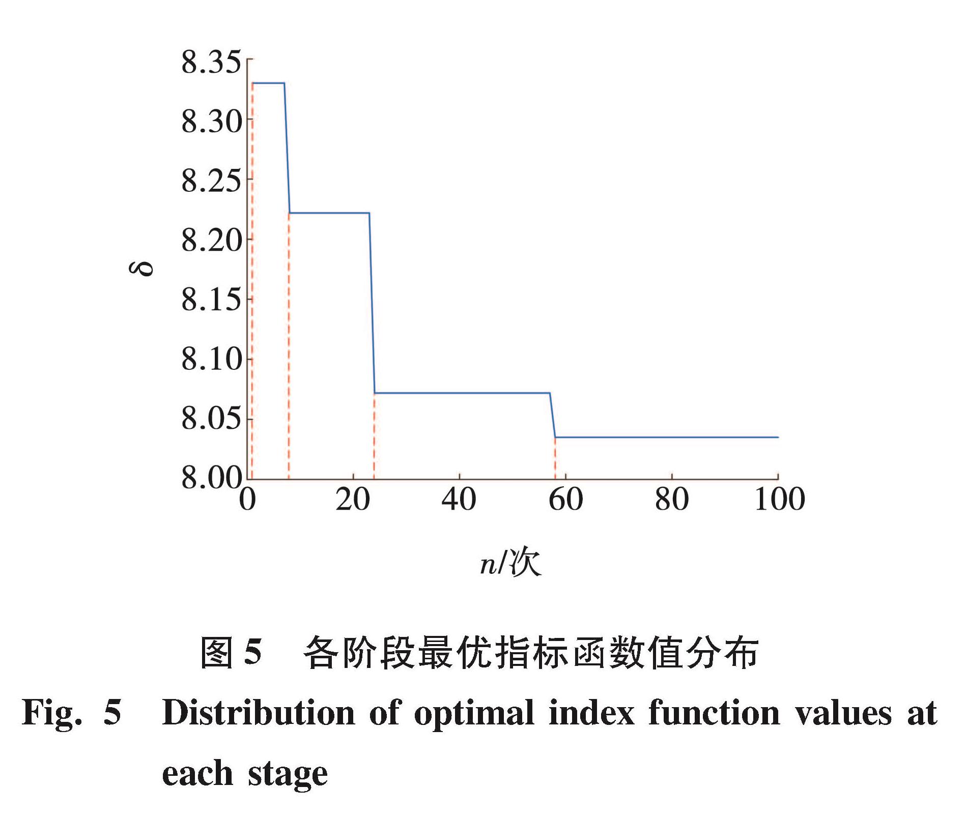 由式(5)、(6)可知,指标函数值越小,则路径跟踪性越好,其寻优所得的KP、KI、KD值更加契合于控制器对当前输入工况的调高控制。算法在迭代过程中各阶段所取得的最优的指标函数δ值,如图5所示。