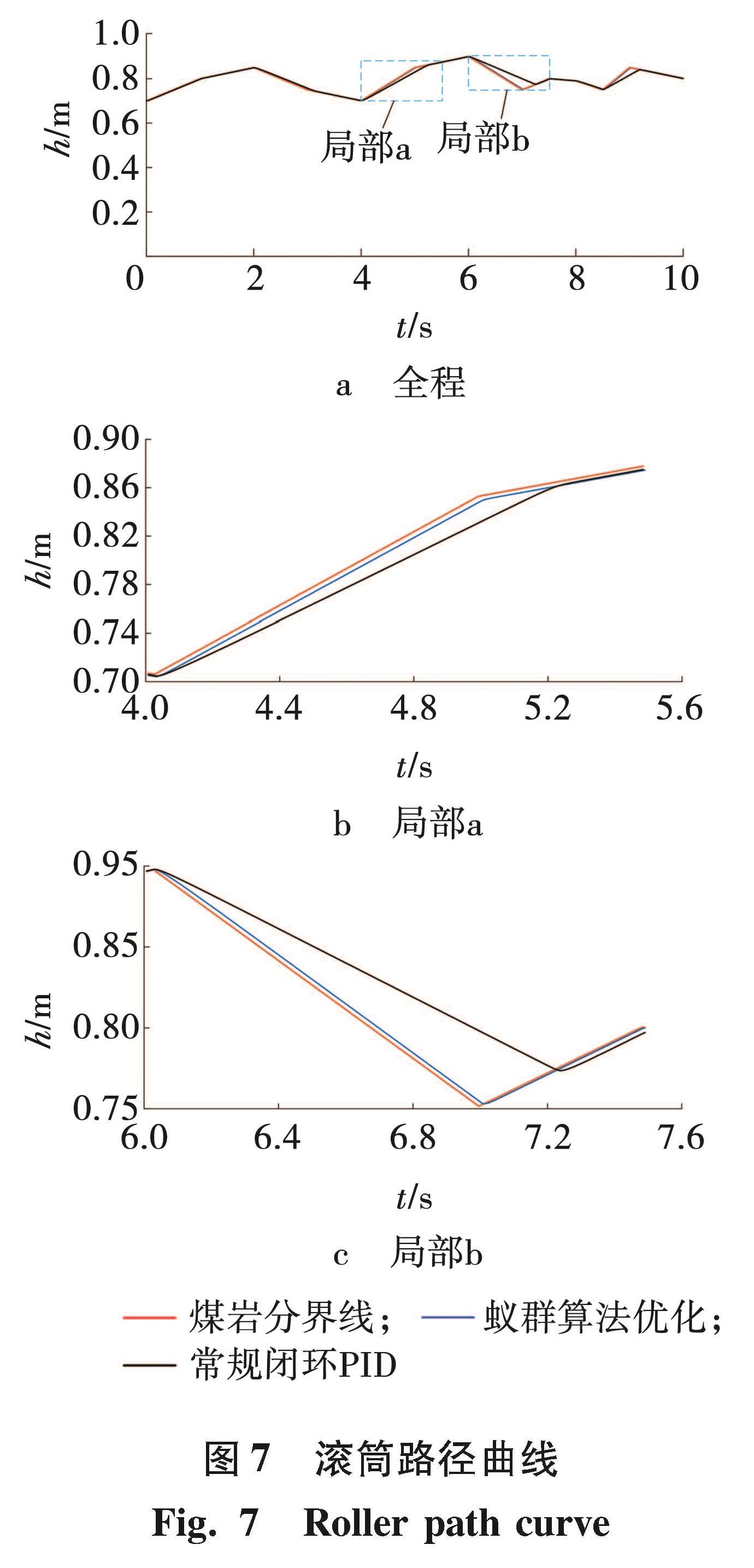 分别选用常规闭环PID控制与蚁群算法优化的PID控制器运行所得(NC=58)的结果,两者进行对比分析。滚筒路径曲线的时程如图7所示。对比两者与设定高度可知,采用优化算法的控制系统输出路径跟踪性更优,基本与设定路径重合,最大偏差值小于0.01 m。
