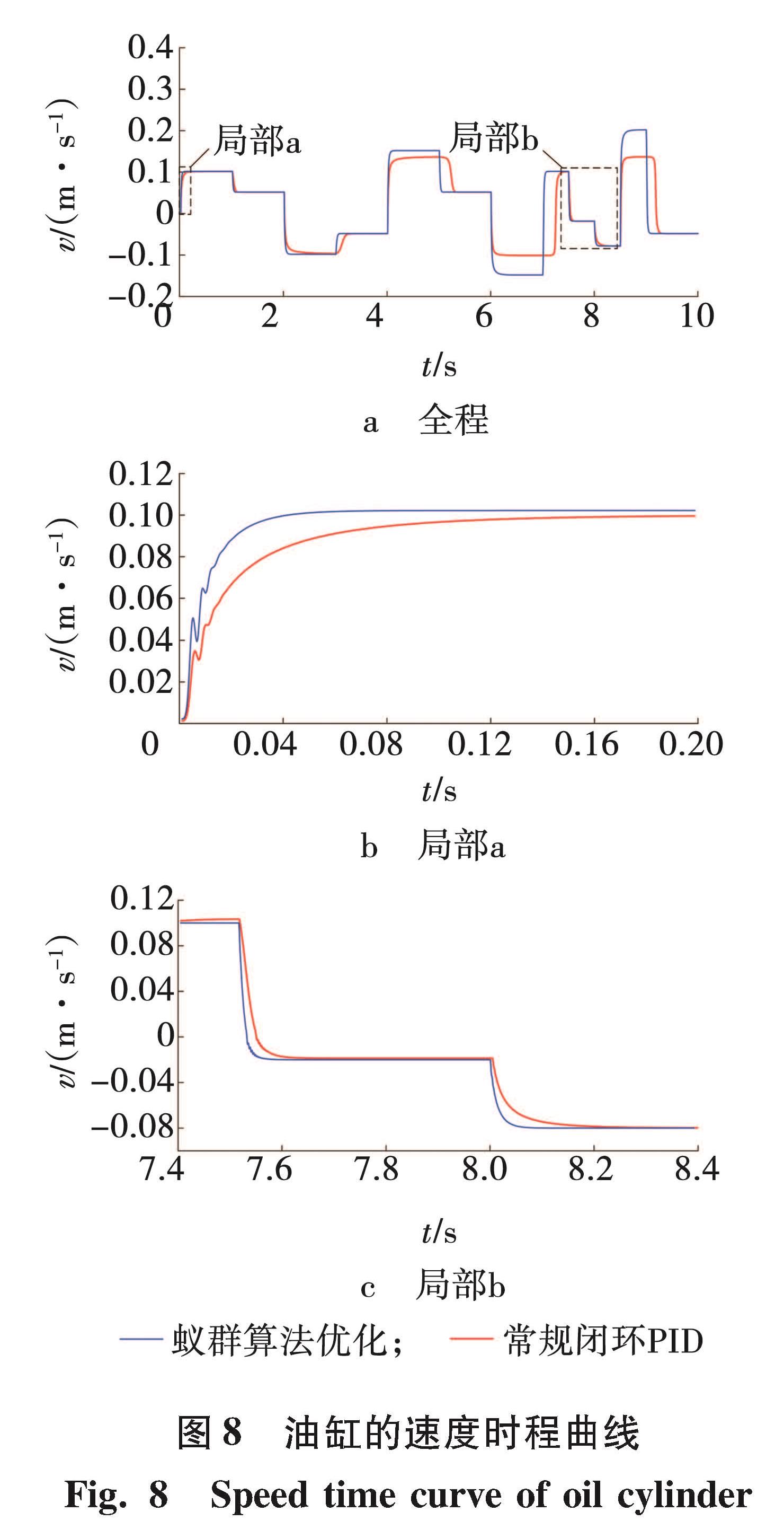 油缸活塞杆速度对比曲线如图8所示。从图8b可以看出,蚁群优化控制系统的响应速度更快,调整持续时间更短,常规控制系统的响应滞后0.2 s(t=7 s),且速度较之慢20%,极大影响控制效果。