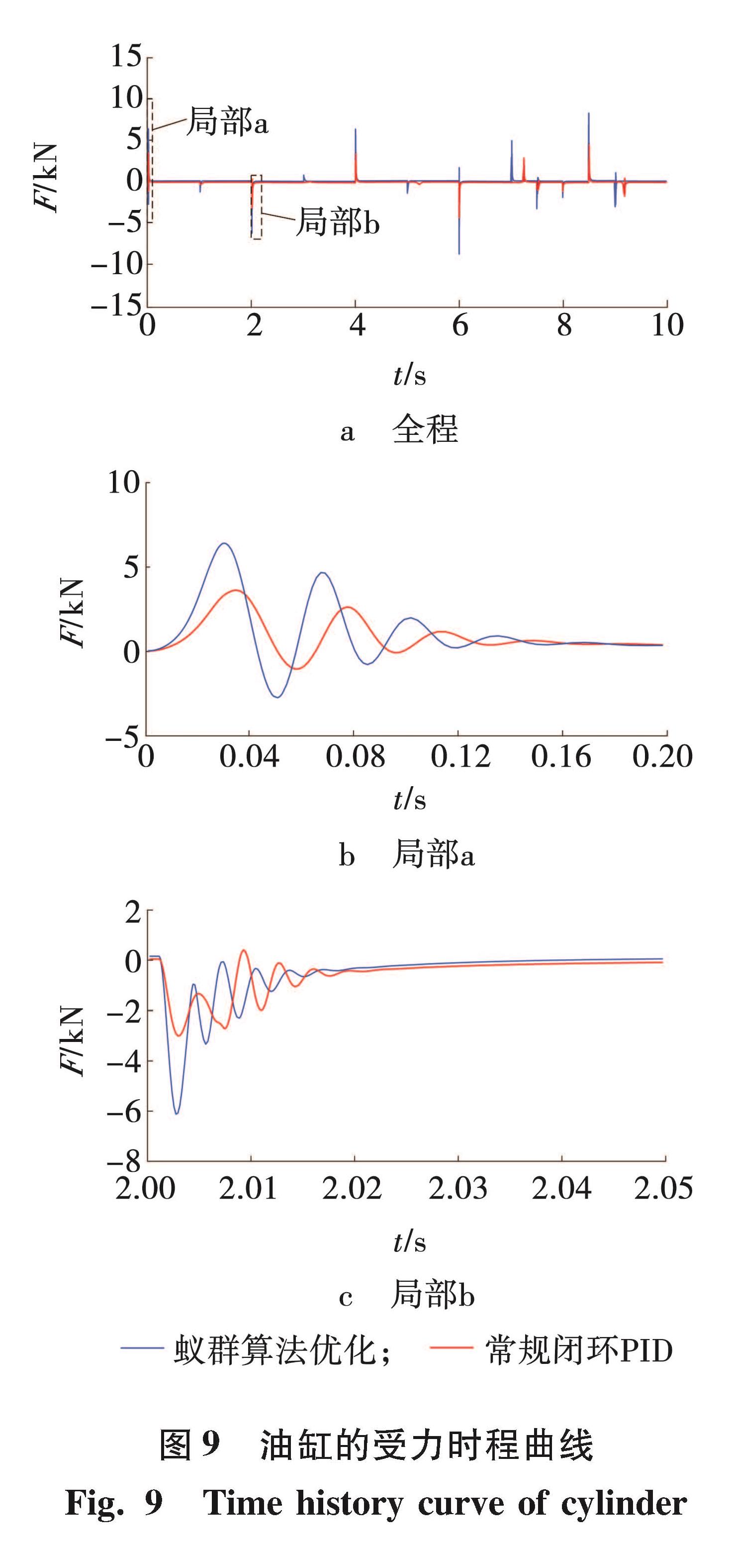 油缸活塞受力时程的曲线如图9所示。在图9c中,路径方向发生反转,油压震荡变化,但控制系统的负反馈调节使其迅速归位并趋于稳定。蚁群优化控制系统的震荡幅度略大,但收敛更快。